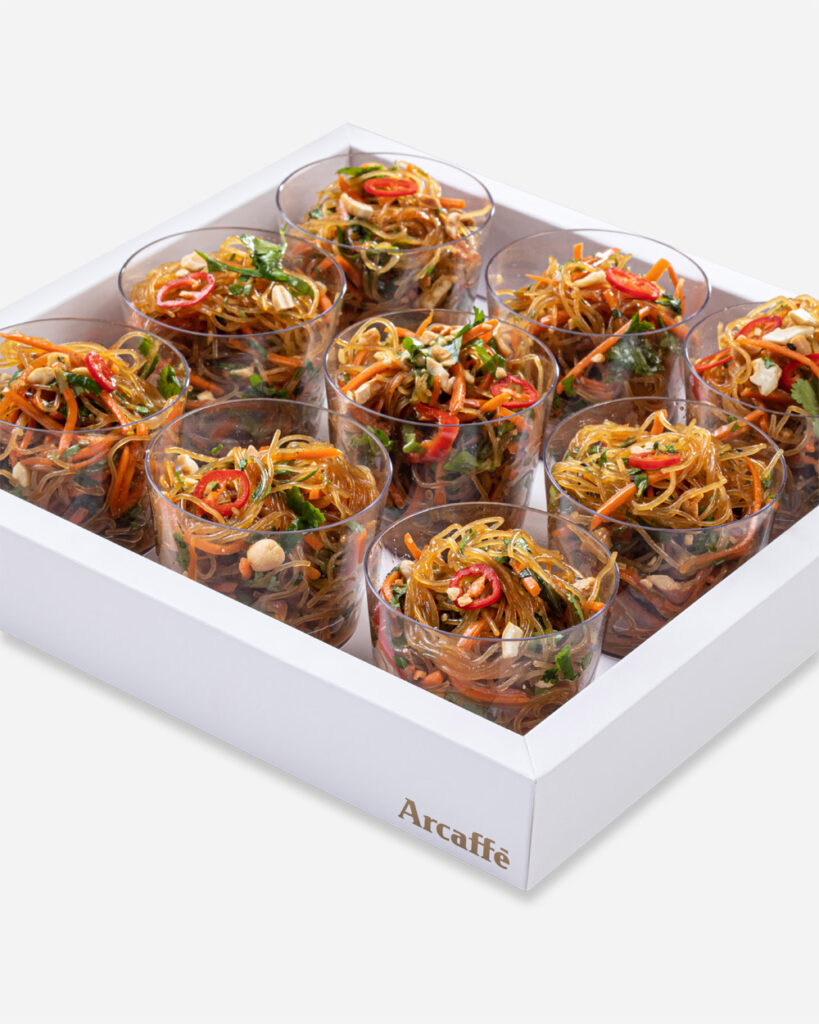 כוסות אישיות עם אטריות שעועית, גזר, פלפל אדום חריף, ג’ינג’ר, כוסברה, בזיליקום, סויה, סילאן וקשיו.