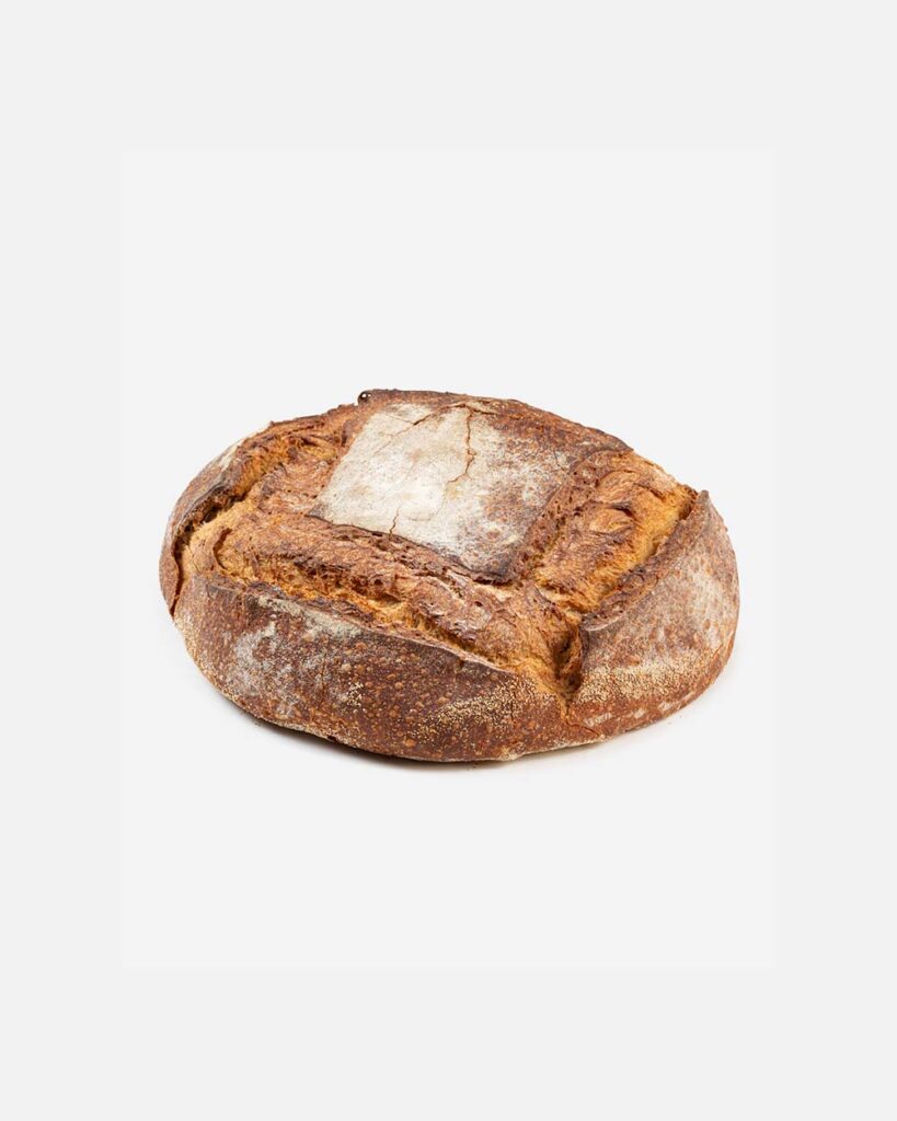 לחם צרפתי על בסיס מחמצת העובר תהליך תפיחה ארוך ואיטי המדגיש את הטעמים העמוקים. בעל קראסט פציח ומרקם פנימי אוורירי. מכיל קמח מלא, קמח לבן, מחמצת.