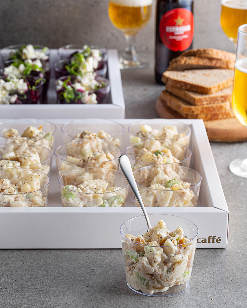 כוסות אישיות עם סלט תפו״א אדמה, סלרי, ריבת בצל מיונז.