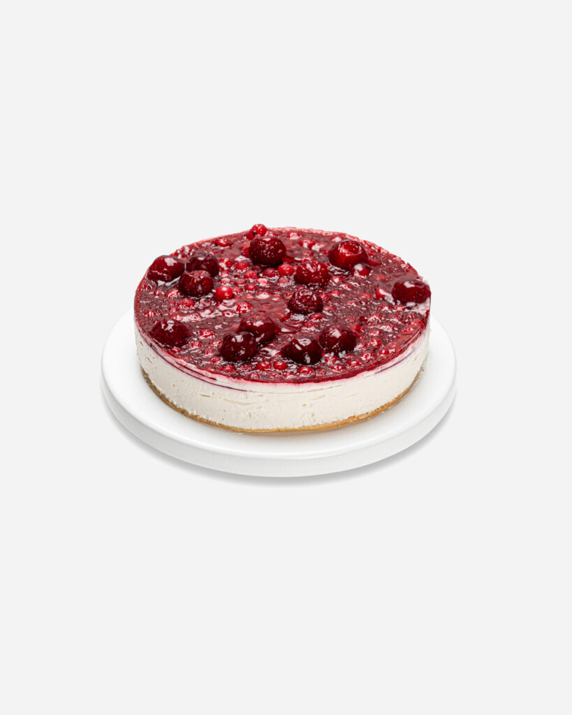 מוס גבינה וליקר דובדבנים בציפוי פירות יער.