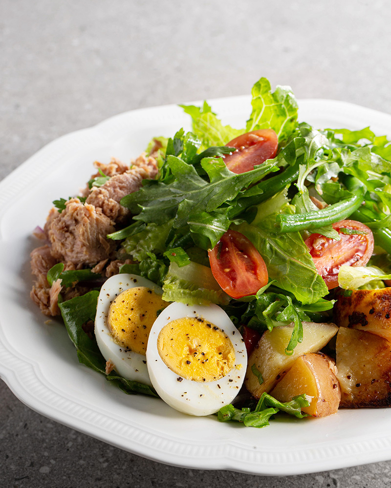 עגבניות שרי, מלפפון, נתחי טונה, ביצה קשה, עלי רוקט, חסה, תפוחי אדמה אפויים, שעועית ירוקה, בצל סגול, בצל ירוק, צנוניות, פטרוזיליה בוינגרט שמן זית ולימון.