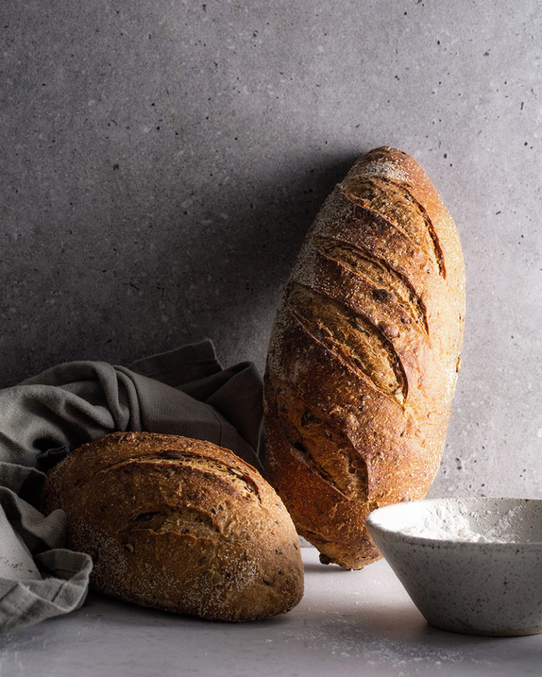לחם מחמצת 80% חיטה מלאה ותערובת דגנים.